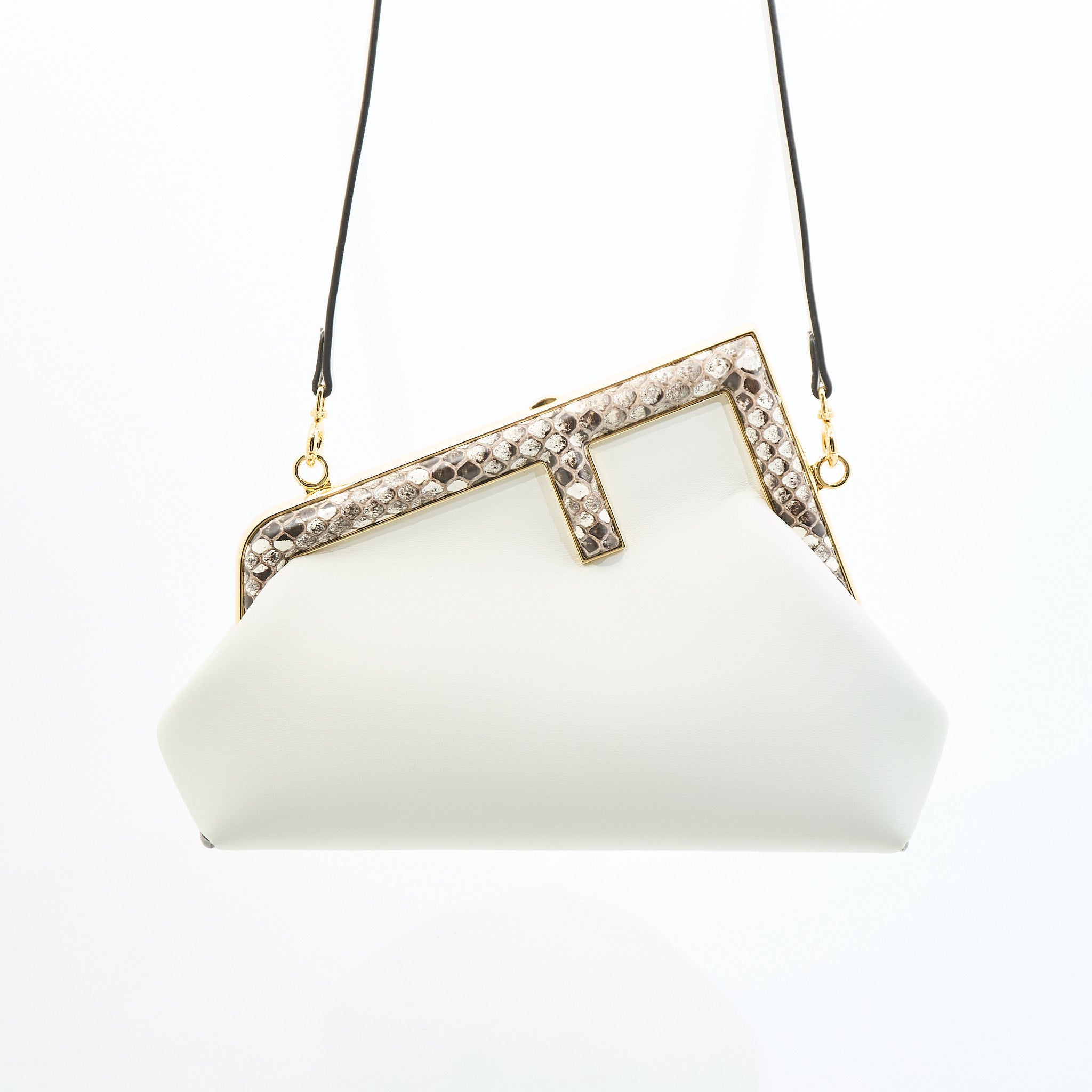 The Small Fendi First bag is crafted from soft white nappa leather and accented with an oversized metal F clasp wrapped in matching python leather. Its interior features a fabric lining adorned with the iconic FF motif, along with removable hooks and gold-finish hardware. Versatile in design, it can be styled as a hand-held clutch or worn on the shoulder using the detachable strap.